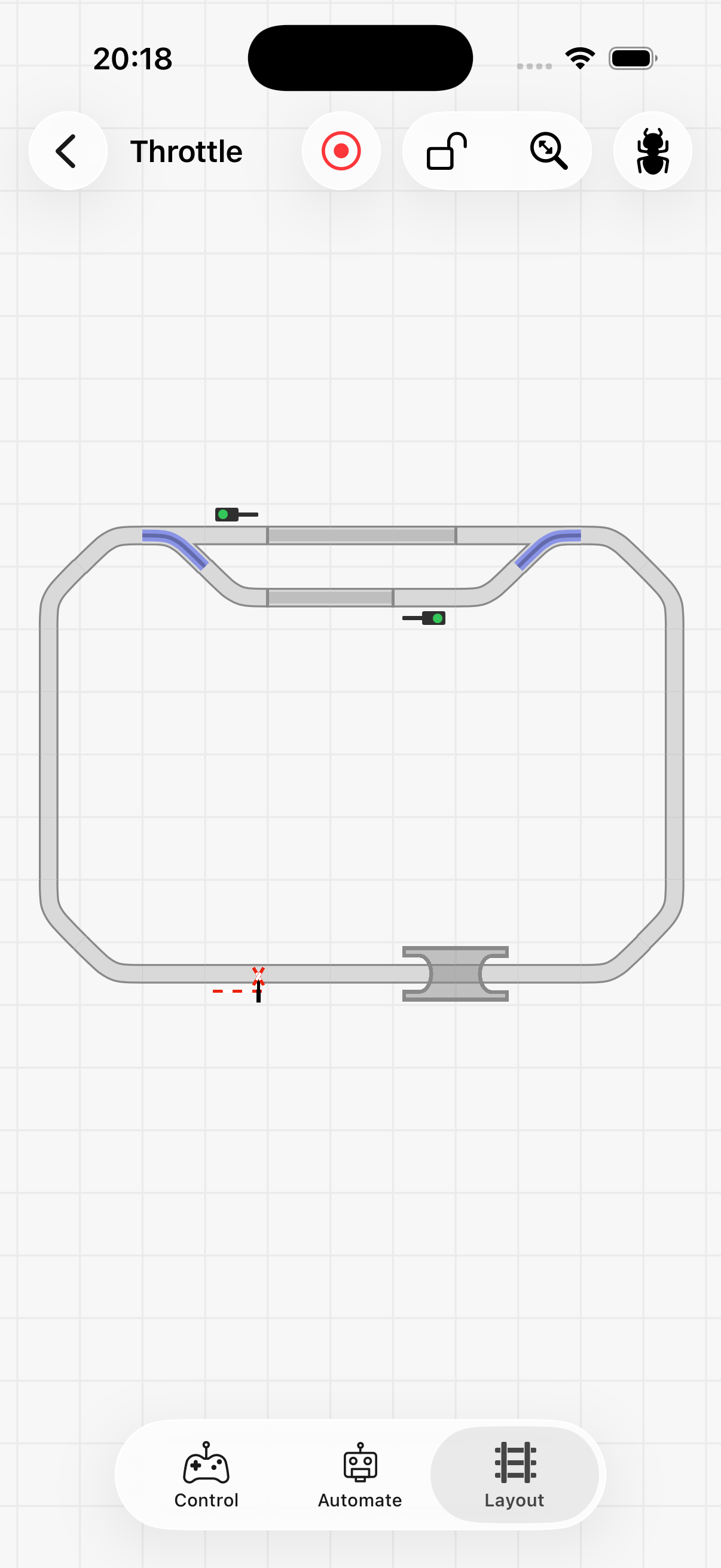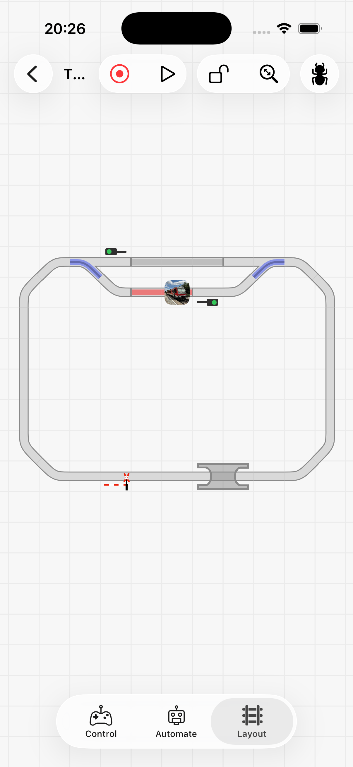 Manchmal benötigen Sie eine bestimmte Abfolge von Interaktionen, um Ihre Automatisierung zu testen — zum Beispiel mehrere Züge, die in einer bestimmten Reihenfolge an verschiedenen Sensoren ankommen. Um die gleichen Schritte nicht manuell wiederholen zu müssen, können Sie Ihre Interaktionen mit der Aufnahmetaste oben auf dem Bildschirm aufzeichnen.