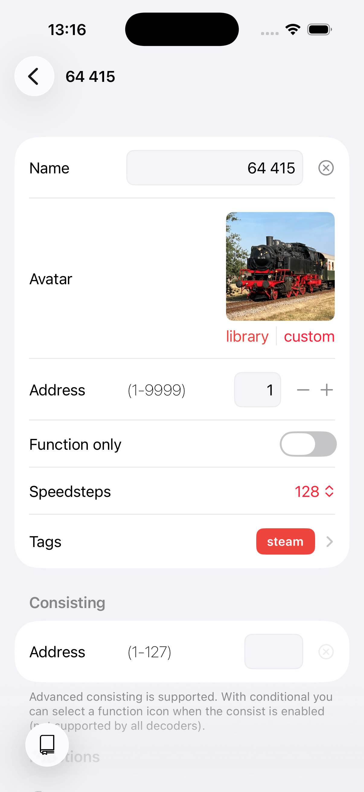 Tags — Fügen Sie Tags hinzu, um Ihre Fahrzeuge nach Typ, Epoche, Bahngesellschaft oder beliebigen anderen Kategorien zu organisieren. Tags können zur Filterung der Fahrzeugliste im Fahrregler verwendet werden.