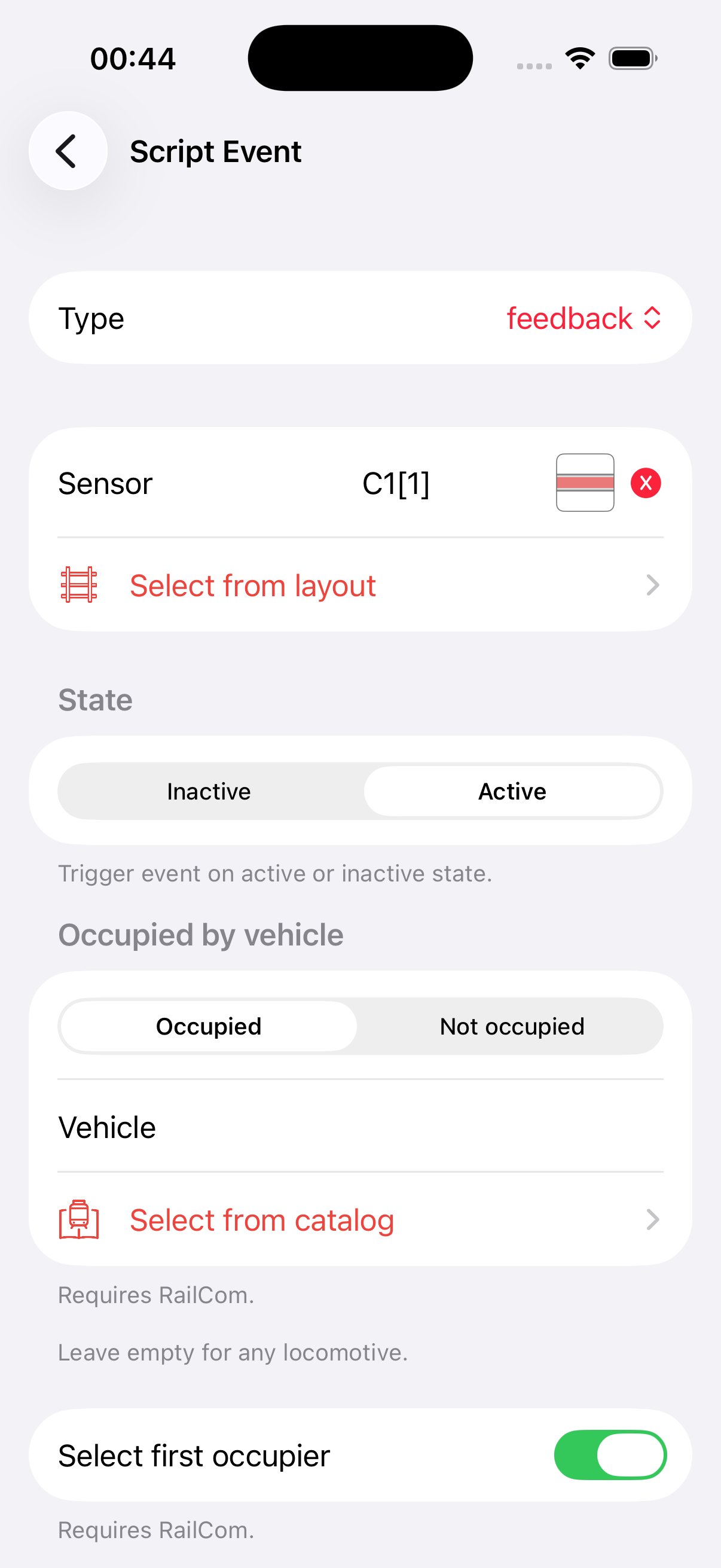 Add an execution event of type feedback and select the sensor in front of signal "S1". Enable Select first occupier — this makes Model Train Script automatically select the detected vehicle when the script runs.