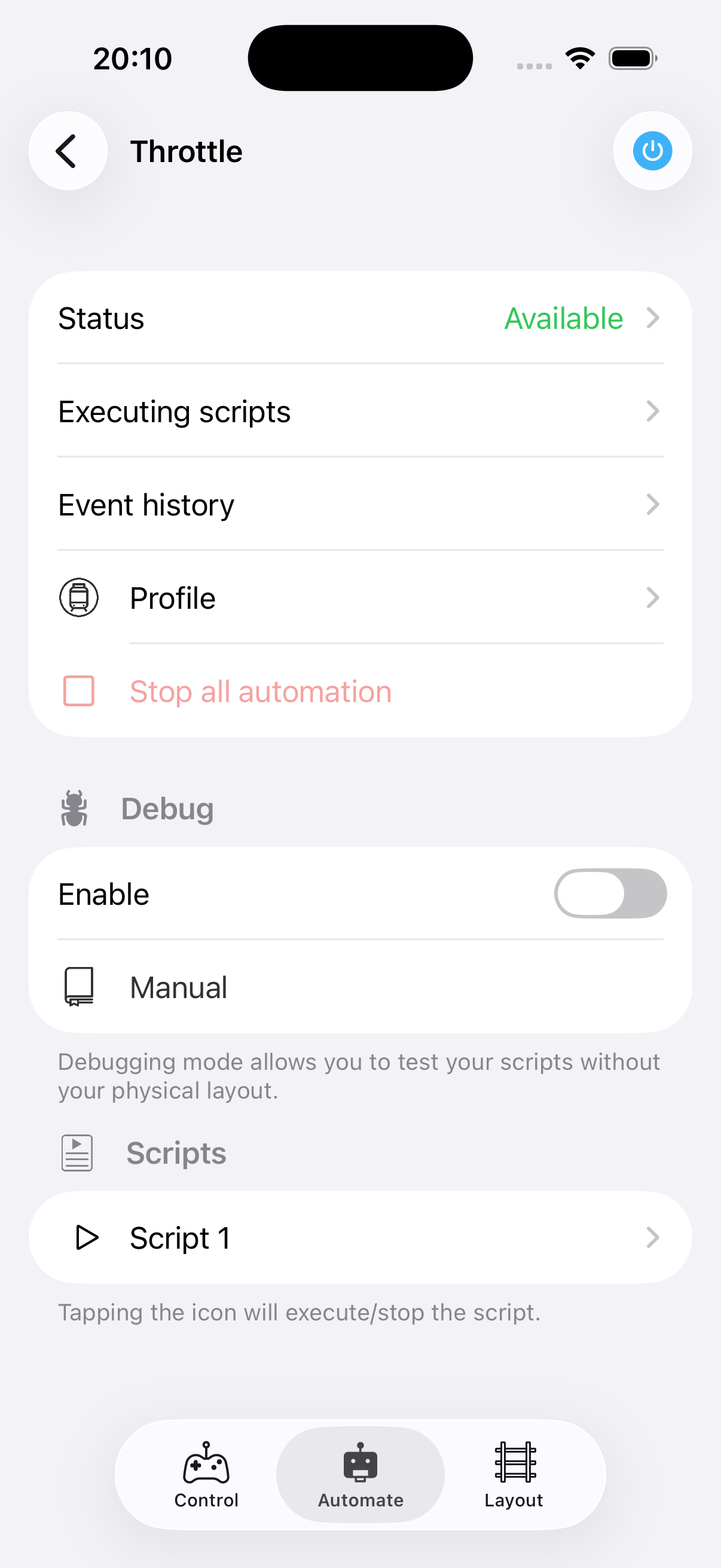 - Scripts — Start or stop scripts directly from the throttle.