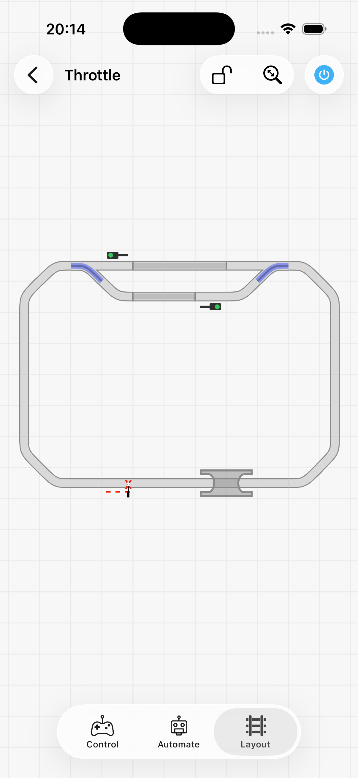Tap the zoom indicator in the top-right to center the layout on screen. You can configure your track plan in the layout editor.